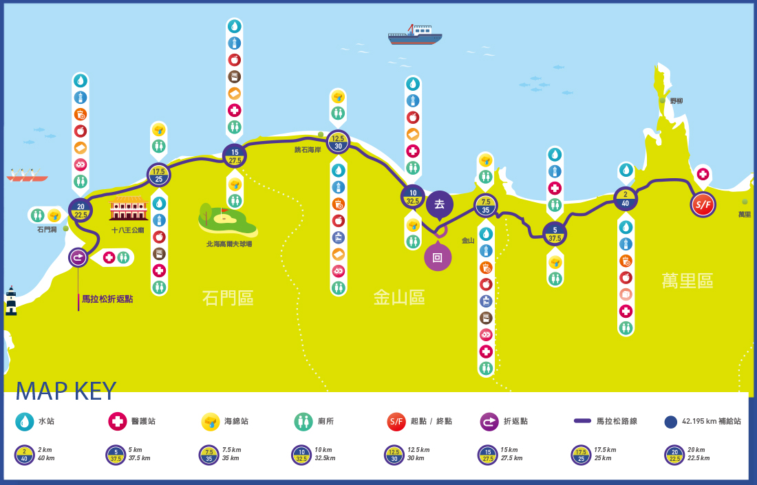 组织方将万金石景观专属的维纳斯海岸设计成赛道,完整地为全球热爱马拉松的朋友呈现当地景观特色。各国菁英选手的参赛及地方民众加油的热情,也让万金石马拉松不仅符合认证规范,更能展现独特的城市风光。