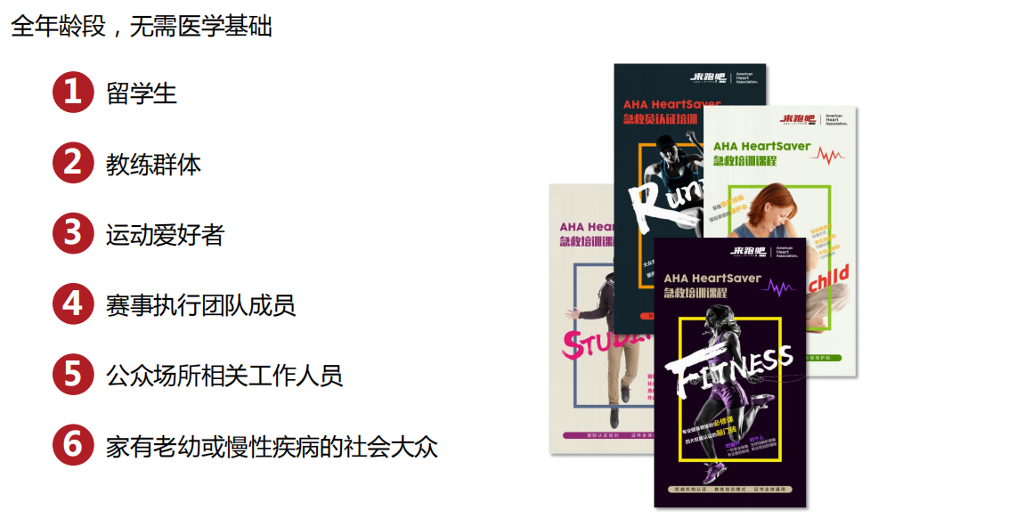 2、完成培训后的两年内,享受全国范围内来跑吧AHA免费的复训服务(非认证);