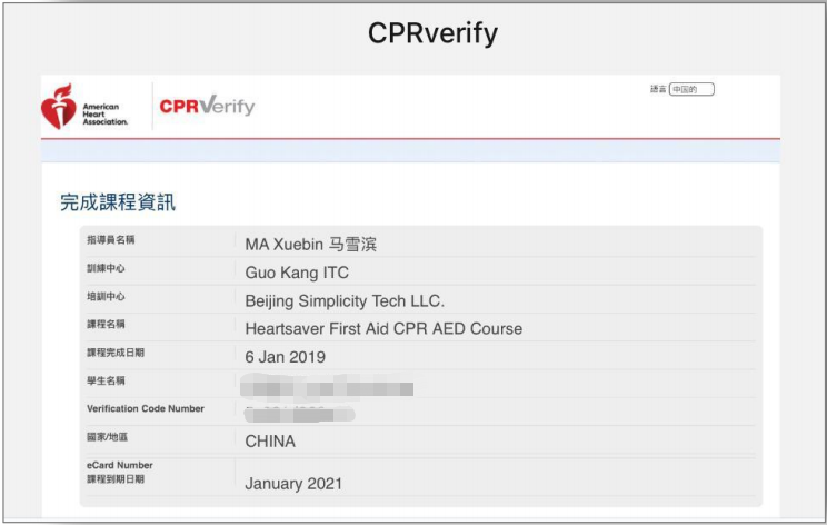 学员获得课程完结证书后均可登录网站:www.cprverify.org/ 进行核准