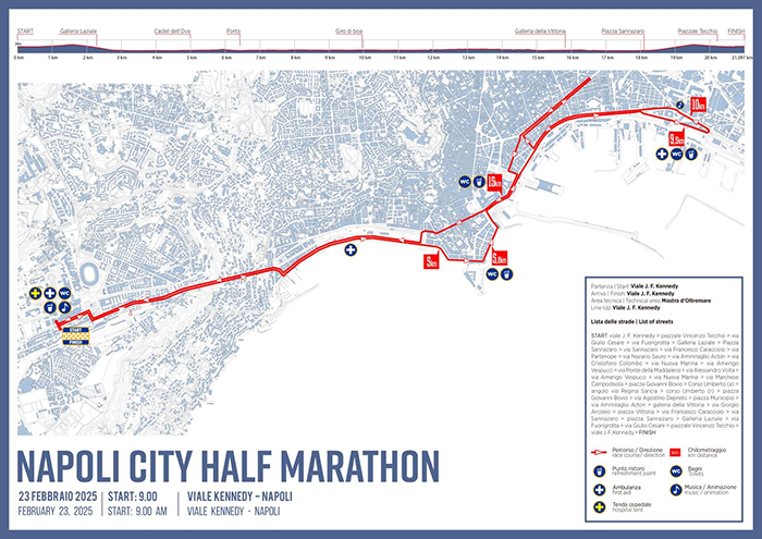 那不勒斯市半程马拉松获得了国际田径联合会世界田径协会的标签。来自欧洲田径的5星级质量比赛,是 FIDAL 的金标比赛。这些认证证明了那不勒斯半程马拉松路线的质量、技术组织、活动和地区的媒体宣传。